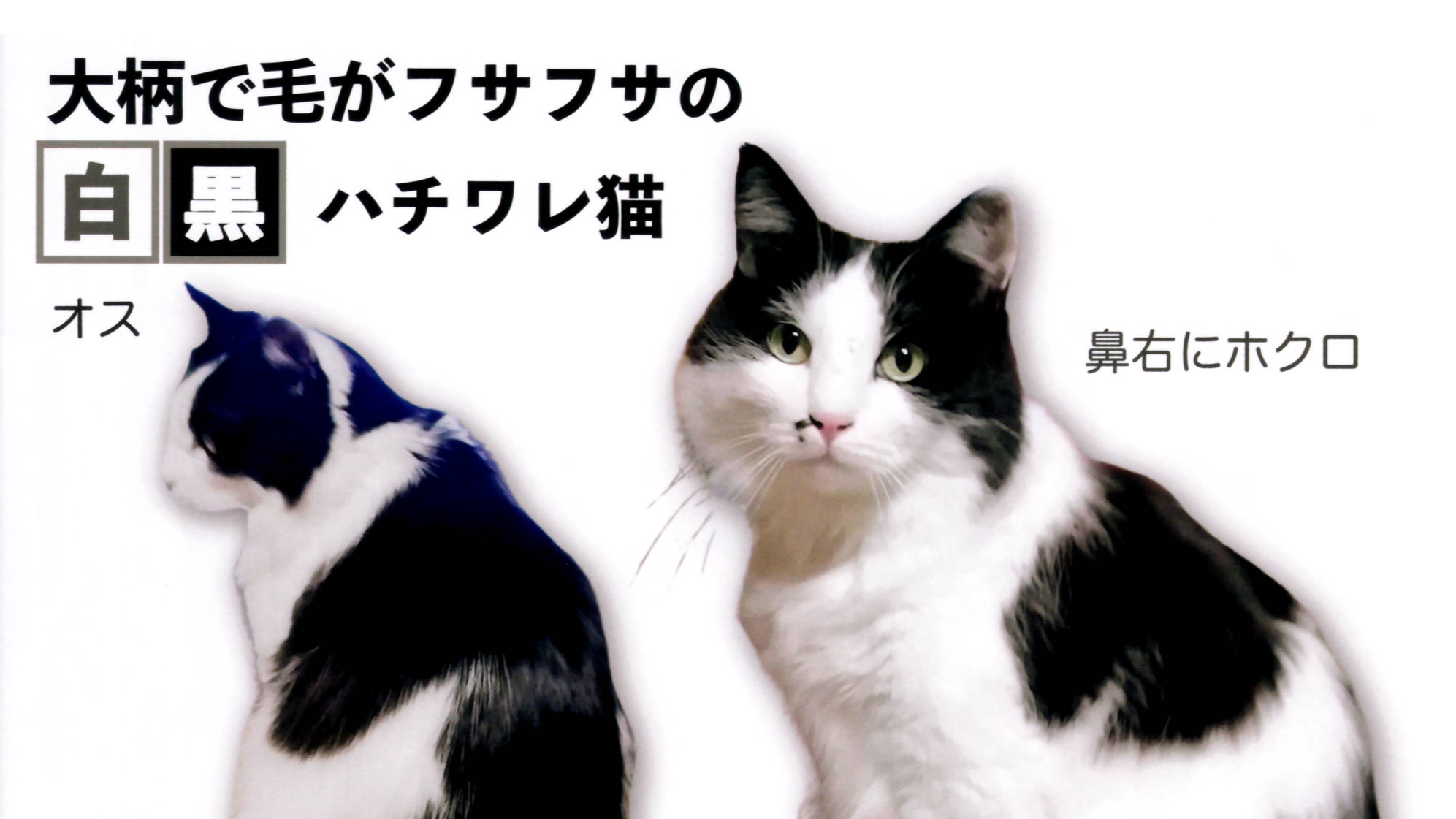 中型よりやや大柄の白黒の長毛でハチワレ、右鼻側にホクロのような模様があります