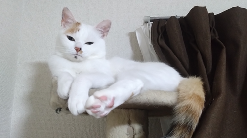 身体は白く、しっぽから茶トラ模様→黒→白と変化します。先端はややかぎしっぽです。