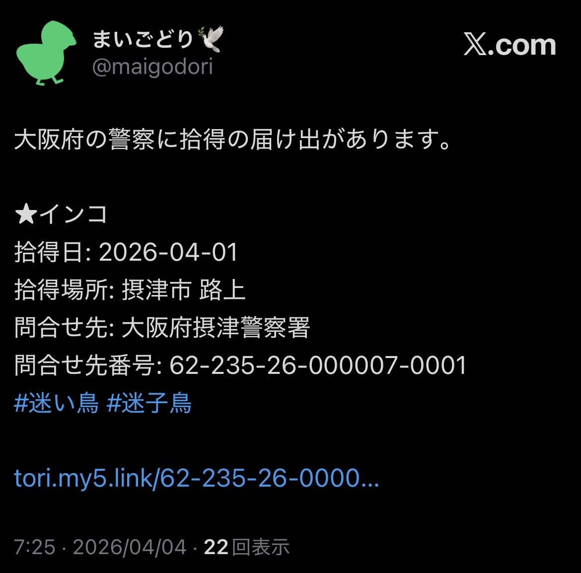 2023.03.192025.04.27 共有: ツイート 通知 すべてクリア 2026年3月28日 大阪府守口市で「オカメインコ」の「ピット」が迷子になりました。#迷子 #鳥 #迷い鳥 #迷いインコ #大阪府 守口市 #オカメインコ 鳥の迷子 最新の投稿 : 匿名 17時間前 2 投稿 2 ユーザー 0 Reactions 257 表示 投稿: 1 ksm トピックスターター 2026年4月3日 18:11 (@ksm) New Member 結合: 1週間前 2026年3月28日 大阪府守口市より迷子になっています。 オカメインコ(ホワイトフェイス) 顔→白色 体→灰色 羽→灰色と白色 尾羽→灰色 歌が大好き。 人懐っこく、手乗り肩乗り。 どんな些細な情報でもお願いします! 発生日付2026-03-28 都道府県大阪府 市区町村守口市 動物の種類オカメインコ 動物の名前ピット 動物の色ホワイトフェイス 動物の年齢1才以下 動物の性別男の子 届出済の警察署守口警察署 画像-1 返信を追加 1件の返信 1件の返信 ASARI (@ASARI) 結合: 17時間前 投稿: 1 2026年4月4日 08:05 返信先ksm @ksm 様 摂津警察署にて保護情報があがっております。 お近くでしたので、もしかしたら…と思い返信させて頂きました。 既に確認済みでしたらすみません。 返信を追加 返信する 投稿者名投稿者メールアドレスタイトル * 添付ファイル: 許可された最大ファイルサイズ 1GB プレビュー 0リビジョン 下書き保存 保存しました 投稿者名 * 投稿者メールアドレス * 添付ファイル: 許可された最大ファイルサイズ 1GB 返信を追加 キャンセル プレビュー 0リビジョン 下書き保存 保存しました