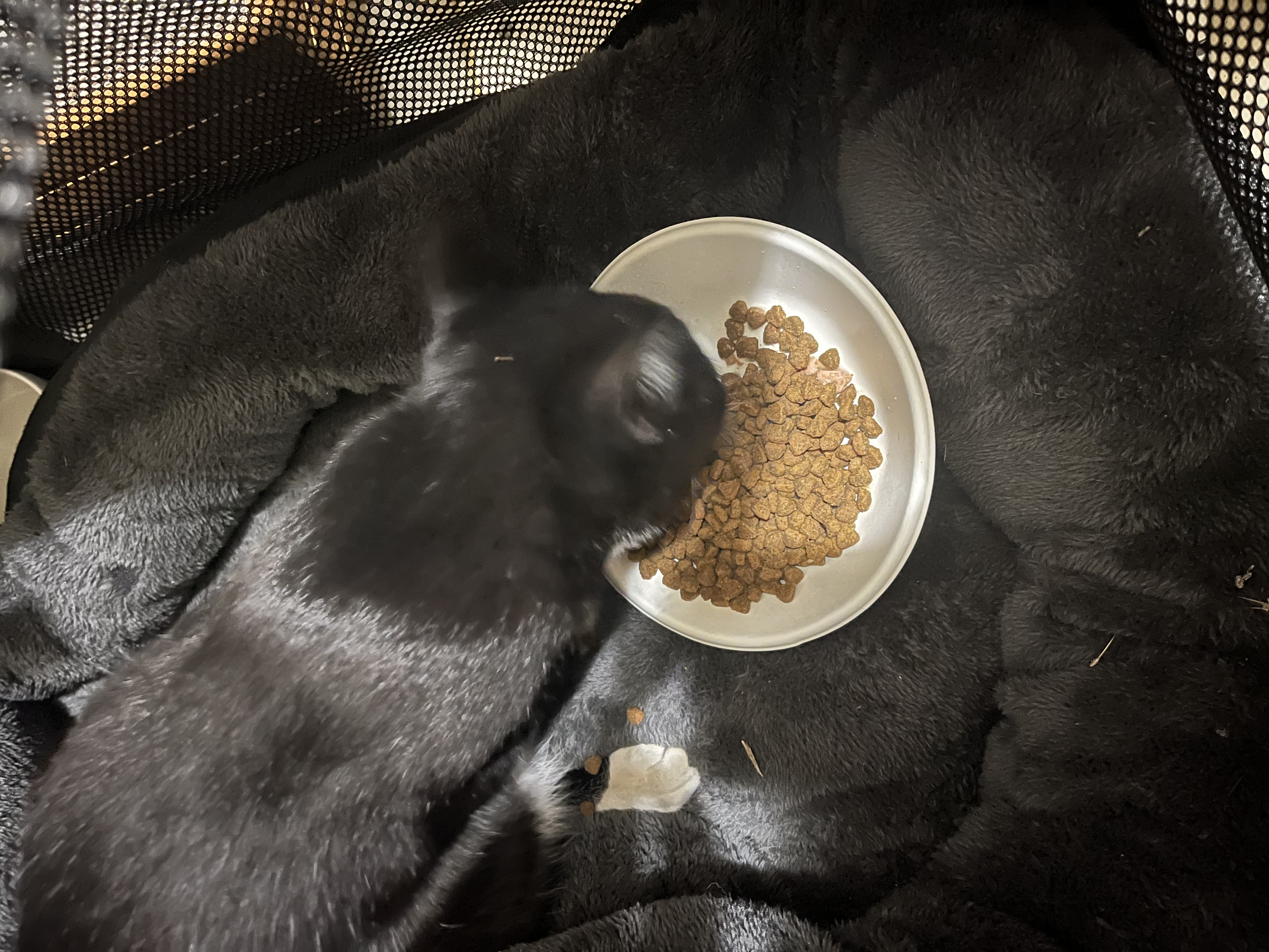 黒白ハチワレで鼻の下にズレた髭みたいなかんじです。