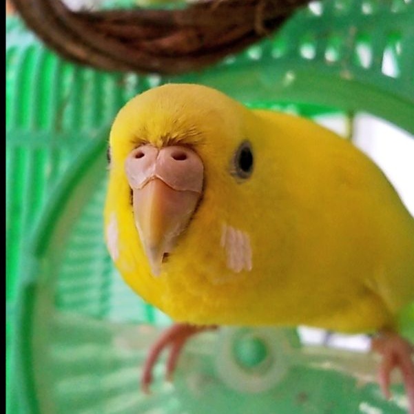 全身黄色、背中に緑の点が1つ、お尻辺りが緑色です