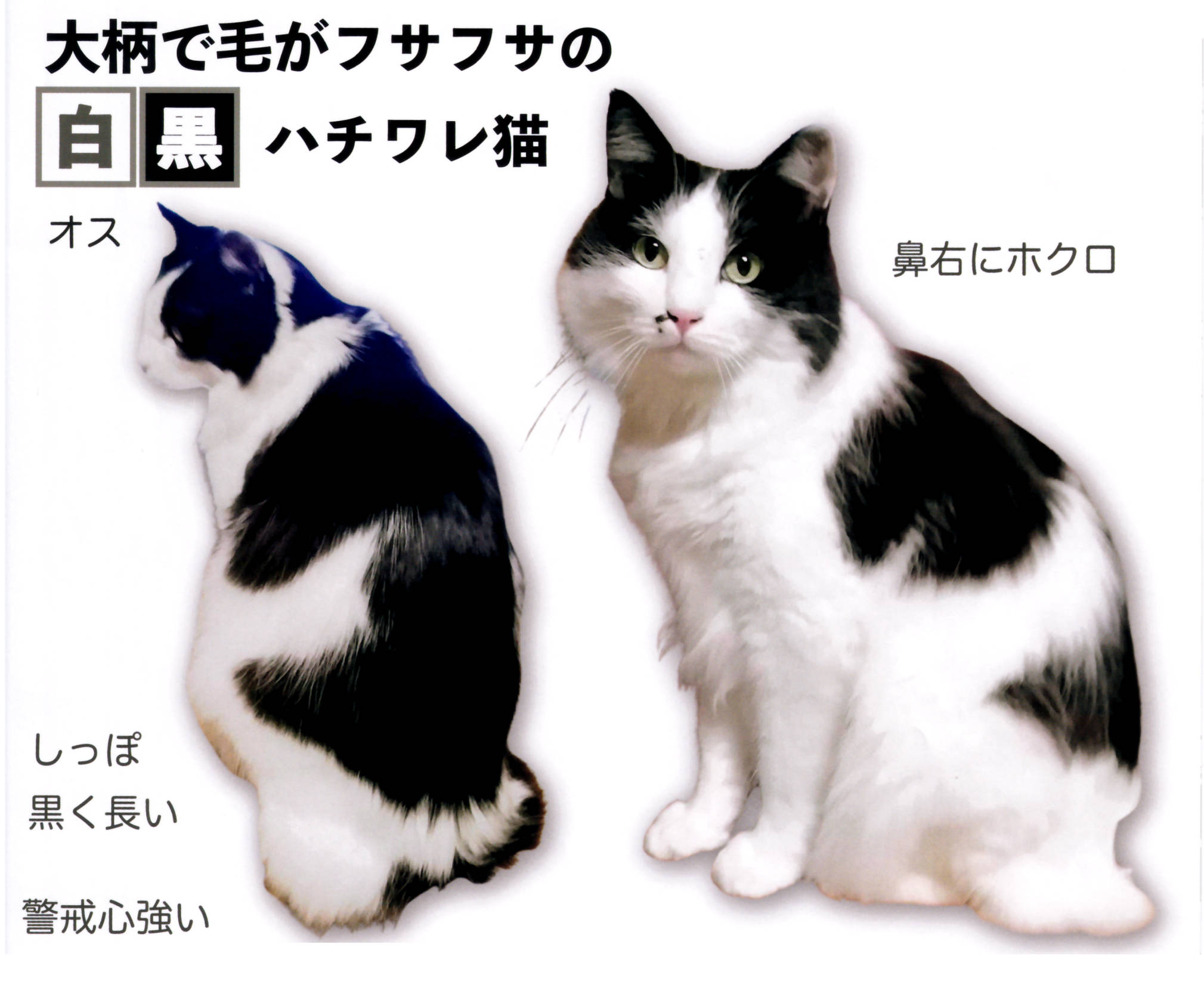 中型よりやや大柄の白黒の長毛でハチワレ、右鼻側にホクロのような模様があります