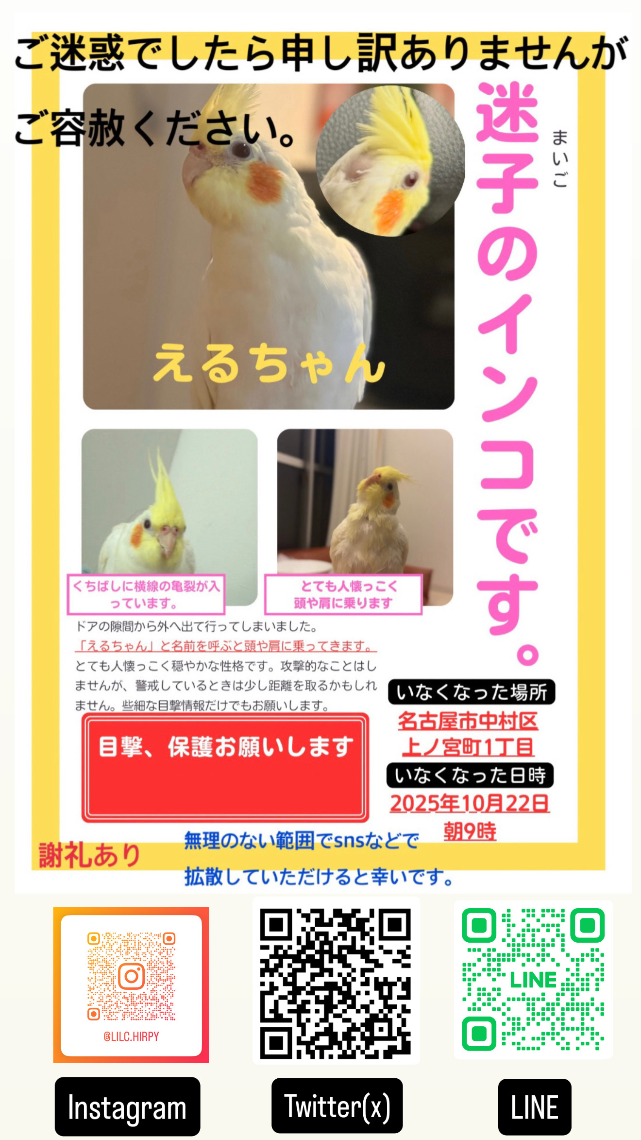 2023.03.192025.04.27 共有: ツイート 通知 すべてクリア 2025年10月22日 愛知県名古屋市中村区で「オカメインコ」の「えるちゃん」が迷子になりました。#迷子 #鳥 #迷い鳥 #迷いインコ #愛知県 #オカメインコ 鳥の迷子 最新の投稿 : さ 3時間前 1 投稿 1 ユーザー 0 Reactions 89 表示 投稿: 1 さ トピックスターター 2025年10月27日 13:35 (@elltyan0303) New Member 結合: 3時間前 10/22 朝9時 名古屋市中村区 不注意でオカメインコが外へ逃げてしまいました。 発生日付2025-10-22 都道府県愛知県 市区町村名古屋市中村区 動物の種類オカメインコ 動物の名前えるちゃん 動物の色白、黄色 動物の年齢1才以下 動物の性別女の子 電話番号09014760311 届出済の警察署中村警察署 警察署の電話番号052-452-0110 画像-1 画像-2 画像-3 返信を追加 返信する 投稿者名投稿者メールアドレスタイトル * 添付ファイル: 許可された最大ファイルサイズ 1GB 返信をメールで受け取る プレビュー 0リビジョン 下書き保存 保存しました 投稿者名 * 投稿者メールアドレス * 添付ファイル: 許可された最大ファイルサイズ 1GB 返信をメールで受け取る 返信を追加 キャンセル プレビュー 0リビジョン 下書き保存 保存しました
