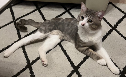 右前脚だけ靴下を履いているような模様です。顔が少し大きく目がクリっとしています。去勢はしていません。人懐っこい子です。