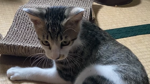 耳の先が白い、鼻はピンクに黒い模様、左の鼻の横にホクロのような模様、後頭部はキジ柄が繋がっている、まっすぐで長いしっぽ、逆三角形の顔、
