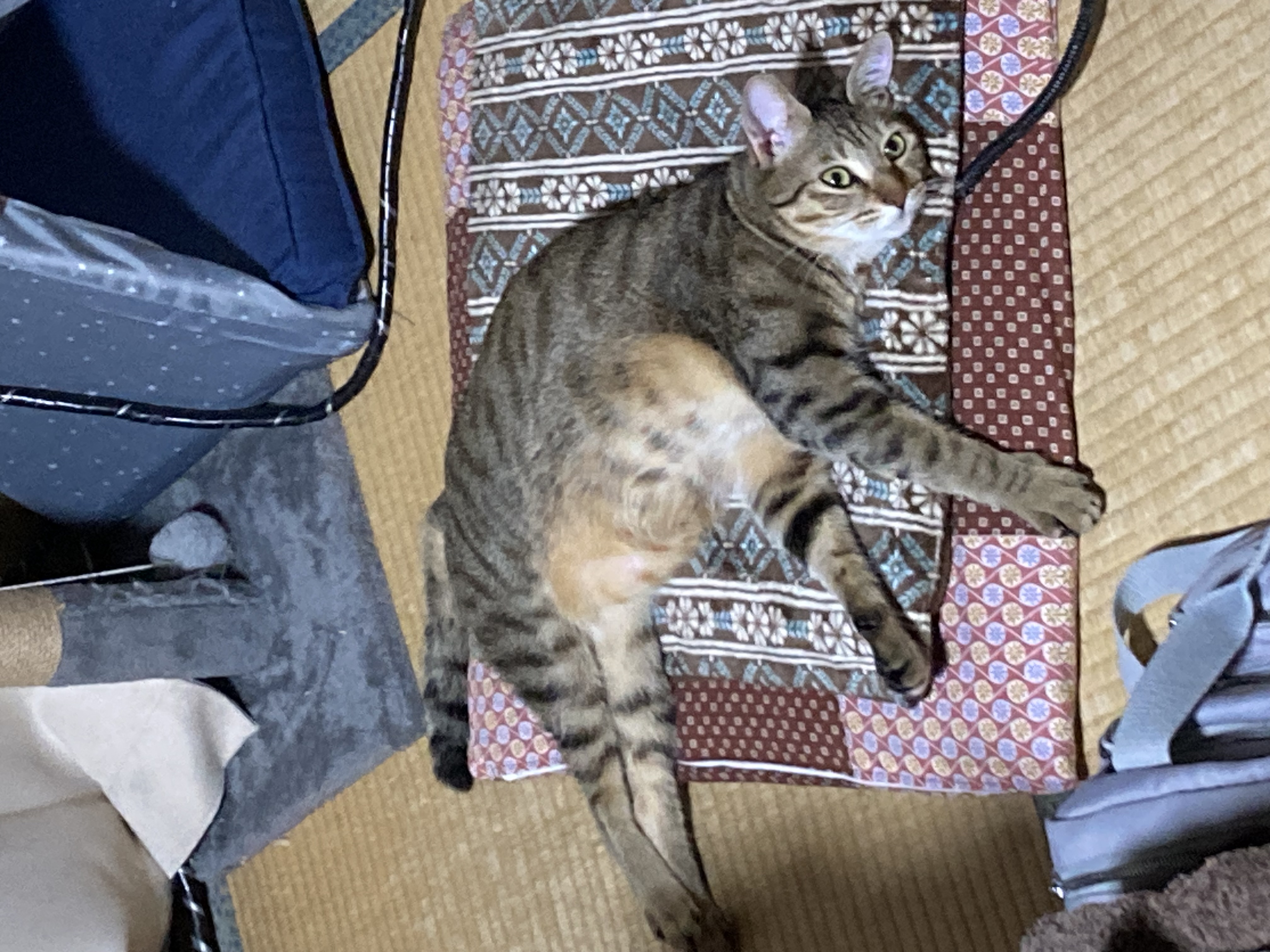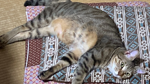 キジトラなので明るい茶色や暗い茶色、黒っぽいのが入り交じった柄です。