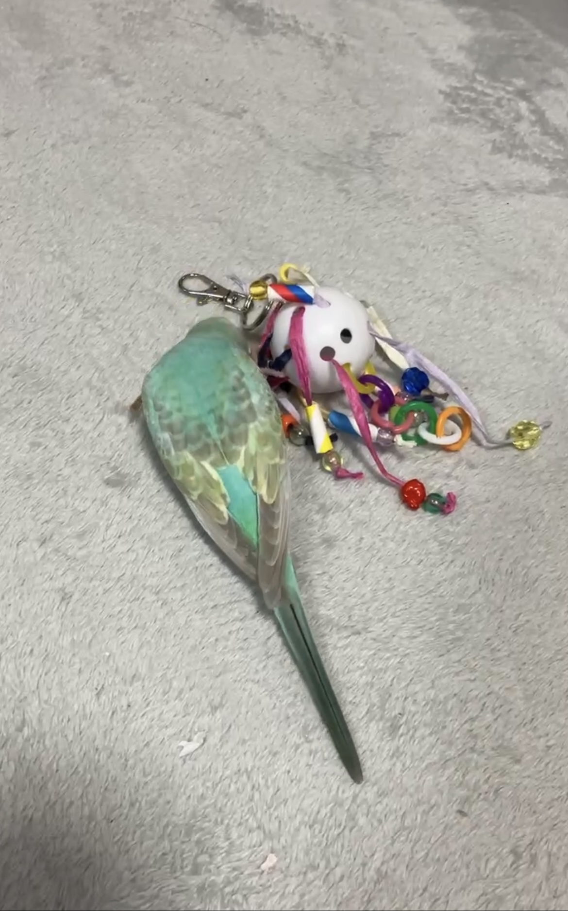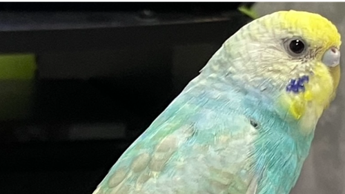色は水色(レインボー)で、頭は黄色です。人懐っこく、手や肩に乗ります。はなちゃんと呼ぶと返事をします。
