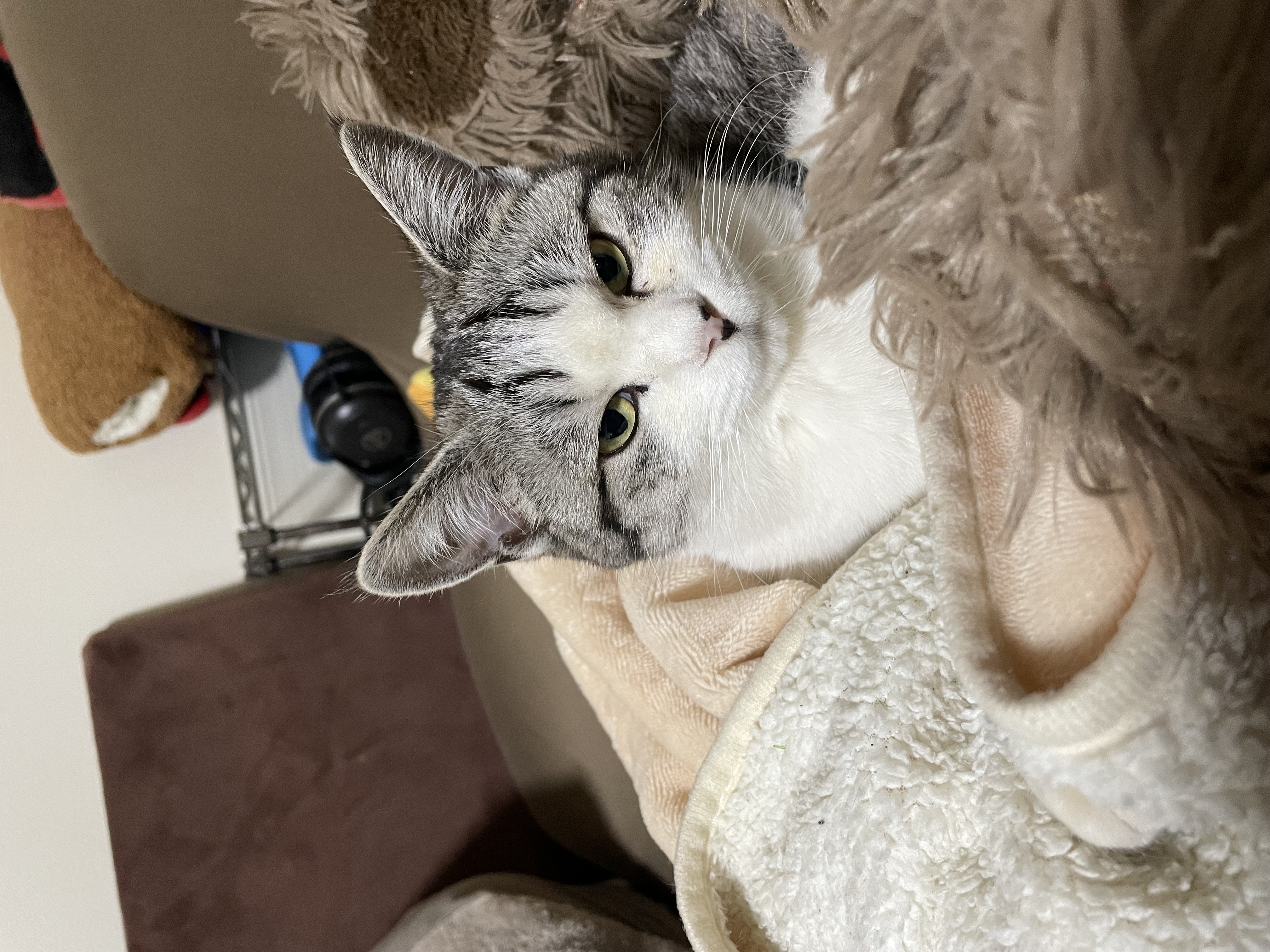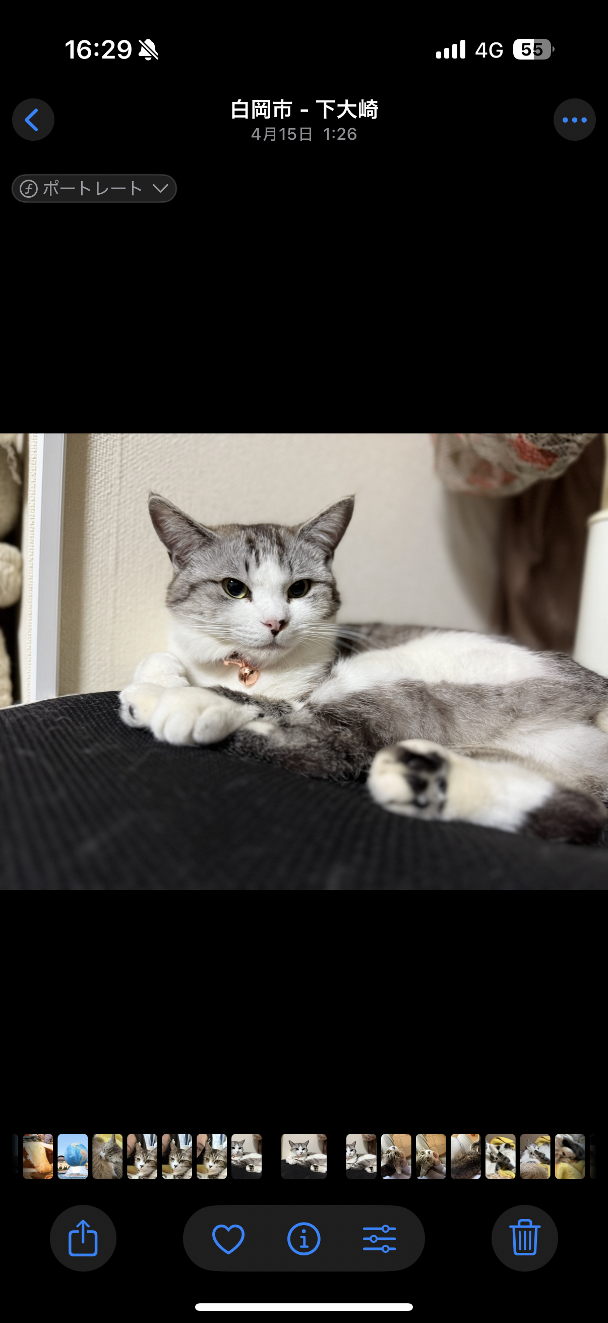 薄紫の首輪をしてます。鈴は付いていません。首輪に彼女の名前と私の携帯番号が彫刻してあります。「Grace」とかいてありますが、呼び名はグレです