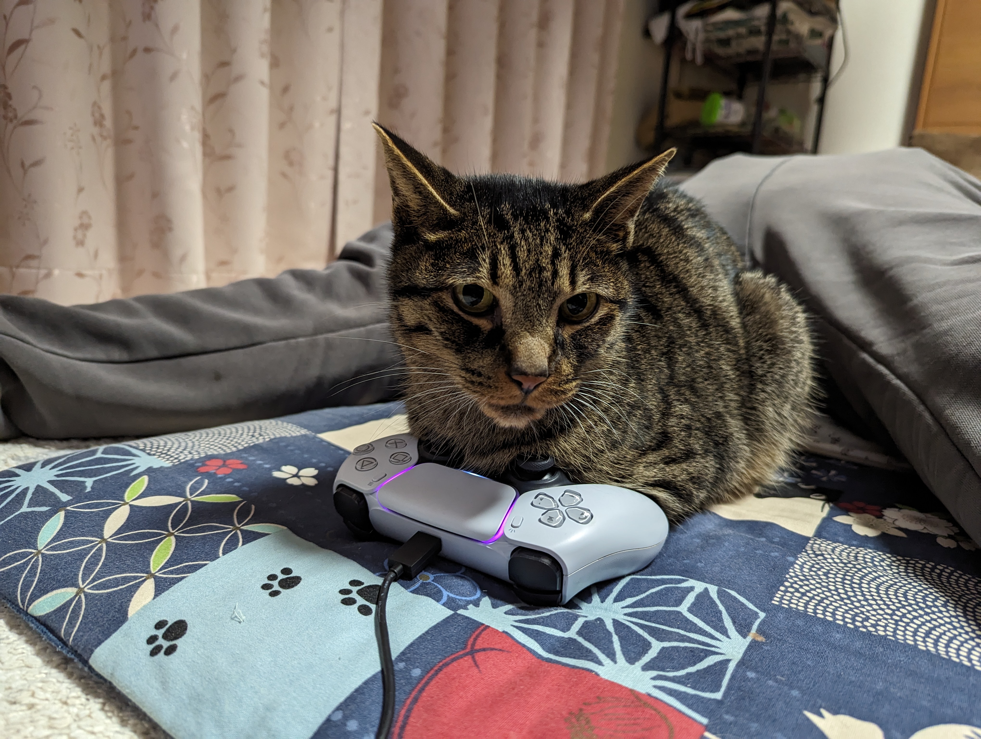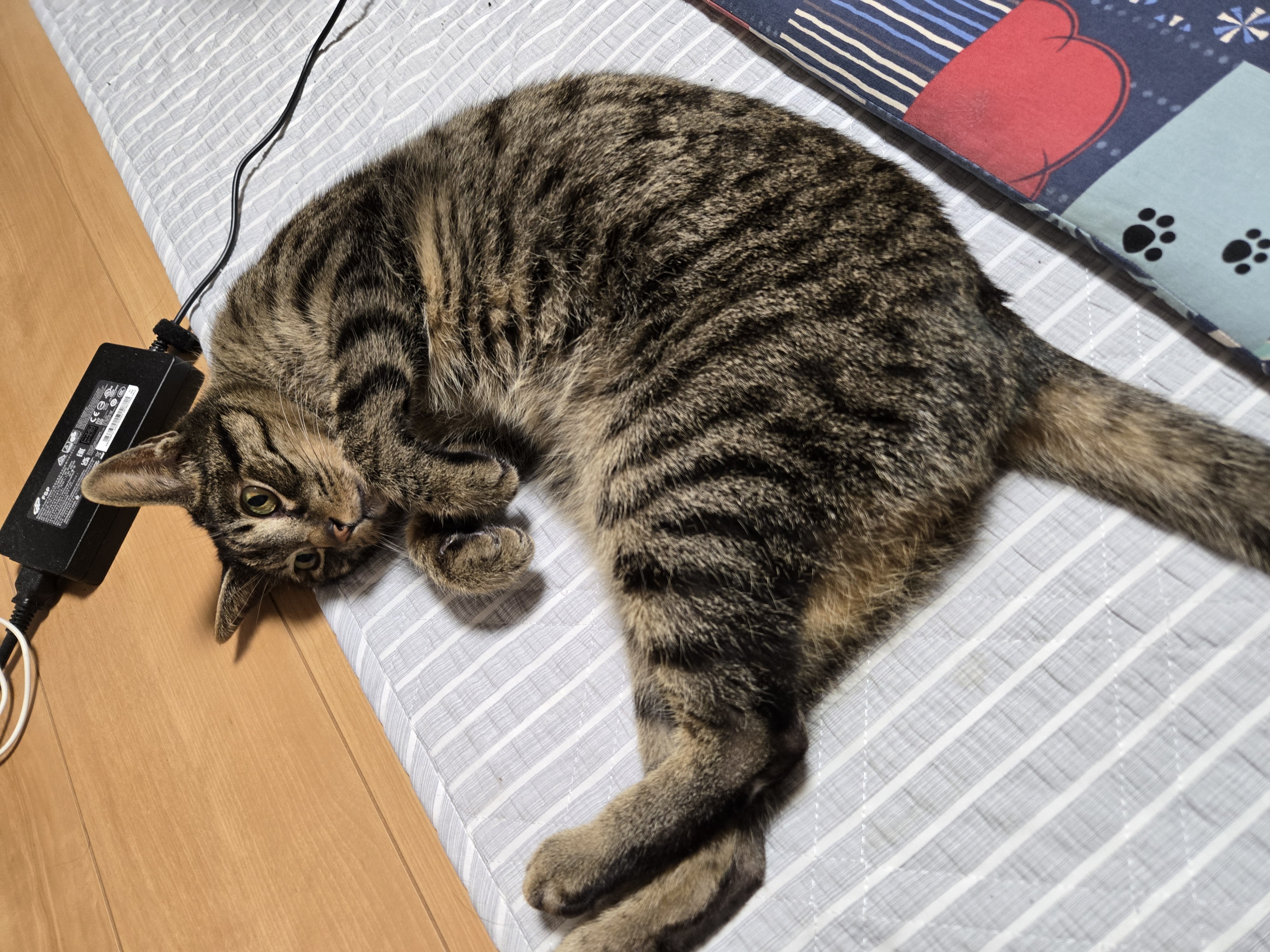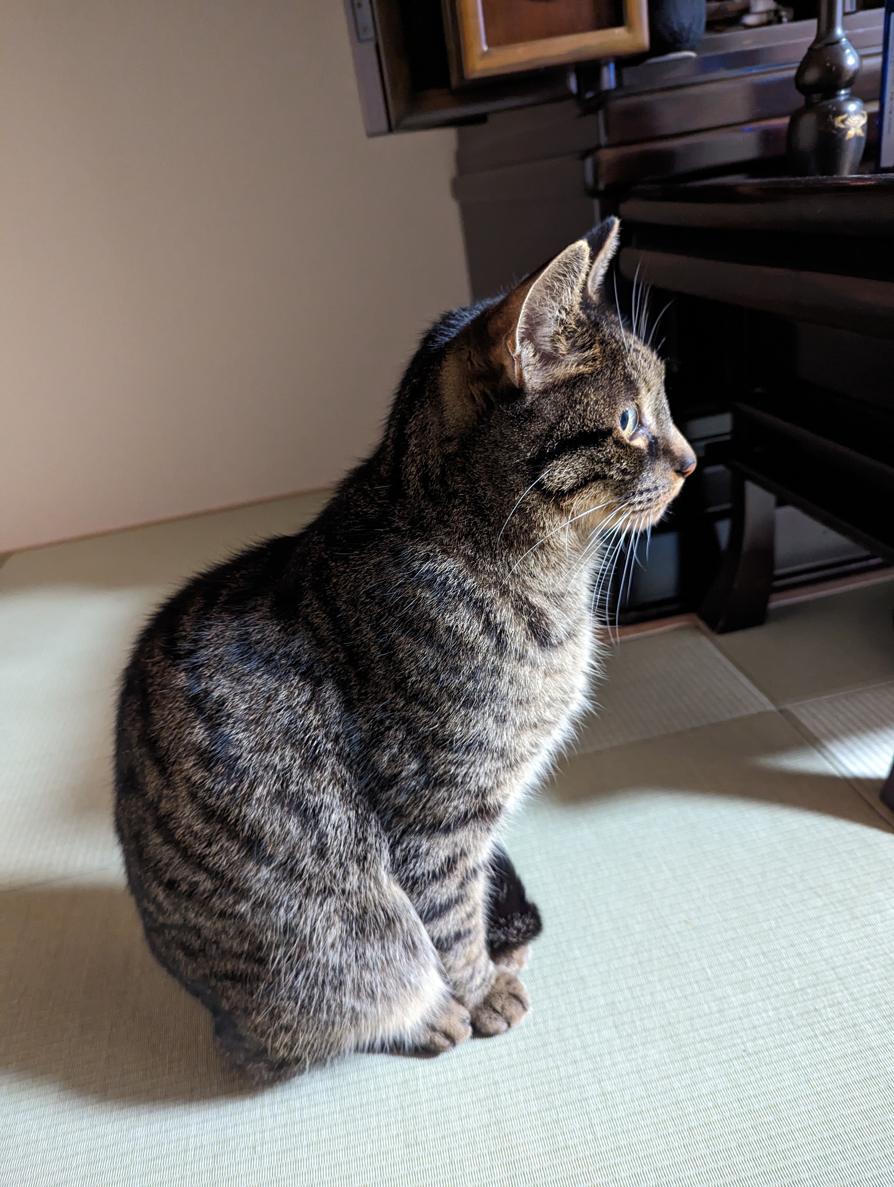 黒っぽいキジトラで、去勢済の男の子です。後頭部が黒く、肩甲骨あたりからお尻の辺りまで背骨にそって黒いラインが入っています。尻尾と手足が長く、たま袋の色は真っ黒で、目の色は金色です。