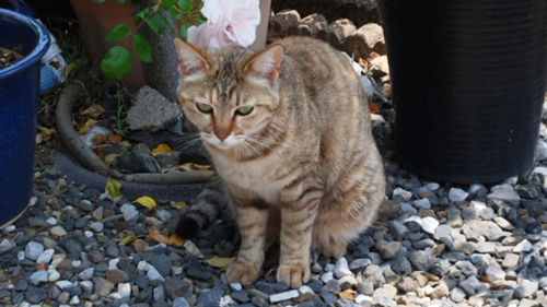 柄はキジトラですが、一般的なものより少し色が明るく、麦わらに近いです。 瞳は少し黄色みがかった緑色です。 警戒心が強く、外では滅多に触れません。