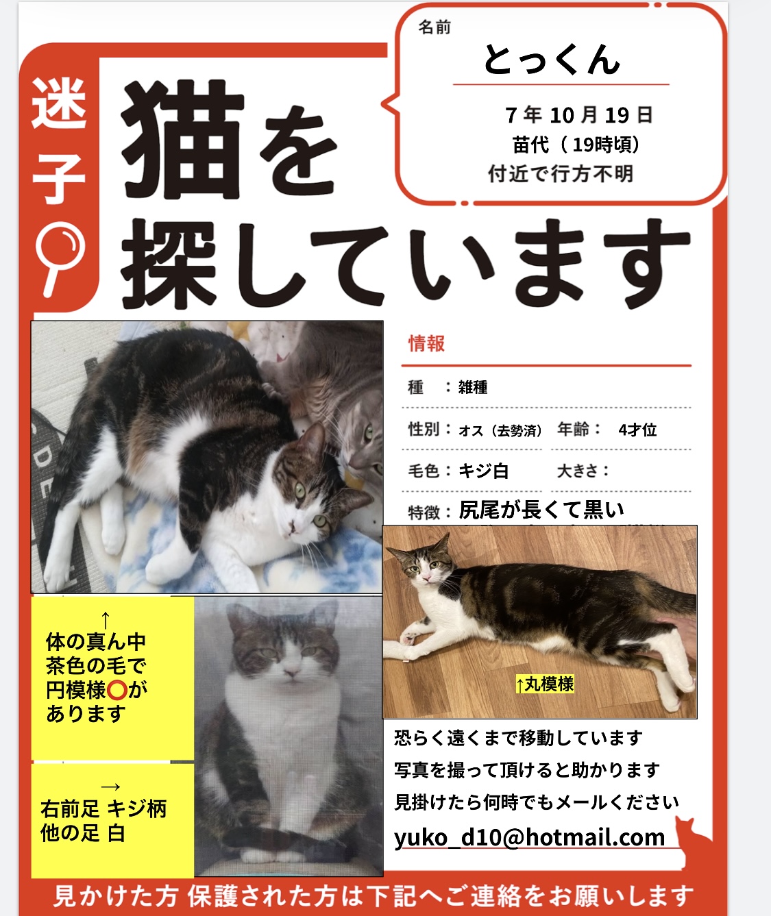 守山区でアメショ柄「キジ白猫」の「とっくん」が迷子になりました。#迷子 #猫 #迷い猫 #ネコ #愛知県 #キジ白猫