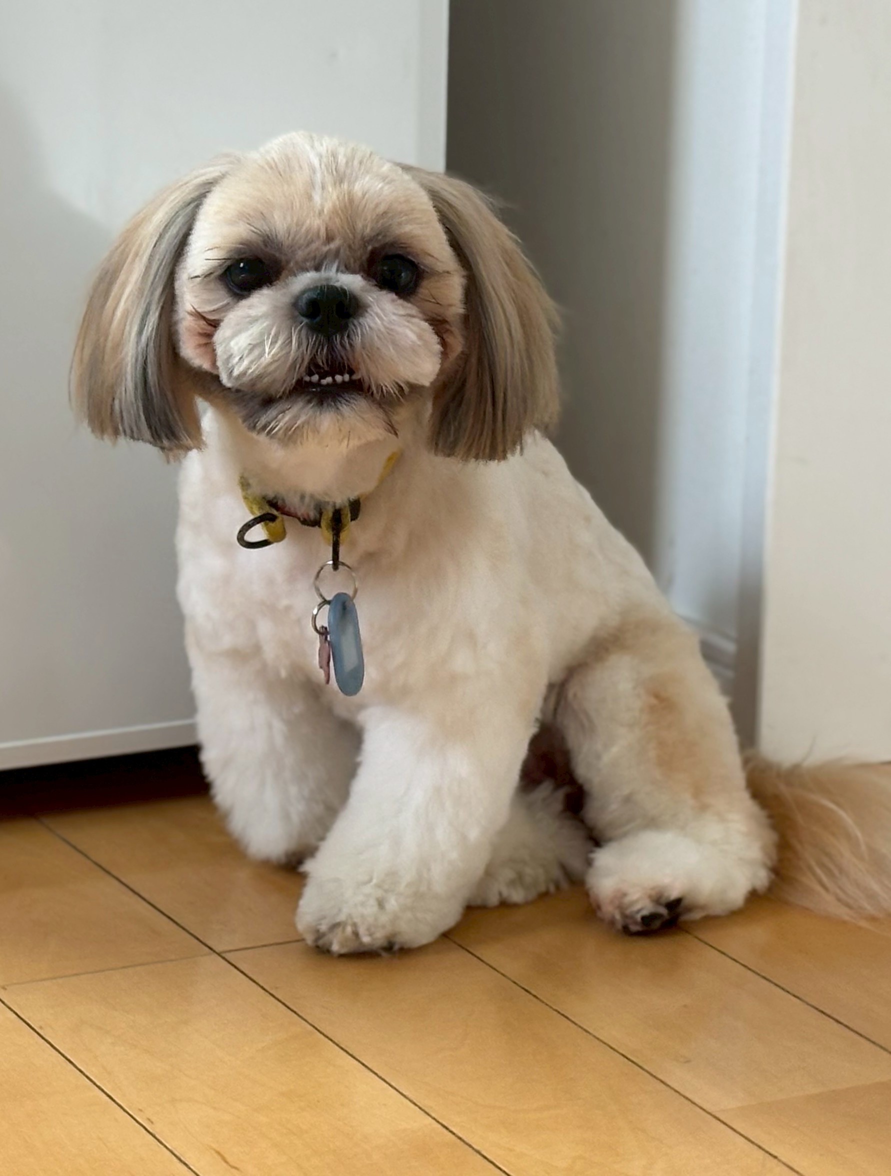 被毛:クリーム✕ホワイト✕ブラウン(トリミングが必要な犬種なので、長い短いで見た目が大きく変わる)