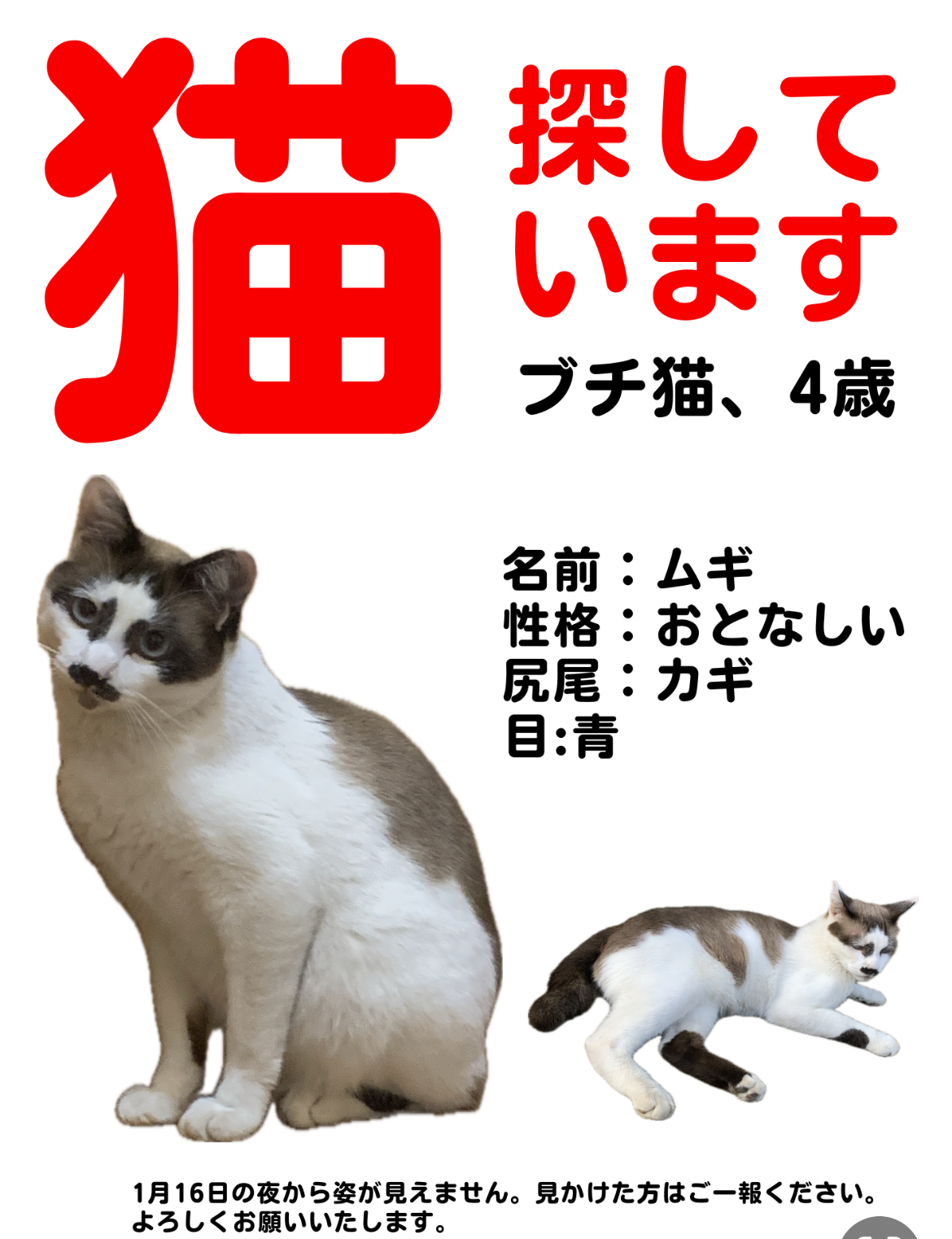 2023.03.192025.04.27 共有: ツイート 通知 すべてクリア 2026年1月16日 茨城県笠間市で「猫」の「むぎ」が迷子になりました。#迷子 #猫 #迷い猫 #ネコ #茨城県 猫の迷子 最新の投稿 : りか 3時間前 1 投稿 1 ユーザー 0 Reactions 73 表示 投稿: 1 りか トピックスターター 2026年1月21日 10:16 (@riri000) New Member 結合: 3時間前 1月16日の夜から家に帰っていません 警戒心が強く 大人しい性格です 発生日付2026-01-16 都道府県茨城県 市区町村笠間市安居 動物の種類雑種猫 動物の名前むぎ 動物の色白 黒 茶 動物の年齢4才 動物の性別男の子 画像-1 画像-2 返信を追加 返信する 投稿者名投稿者メールアドレスタイトル * 添付ファイル: 許可された最大ファイルサイズ 1GB 返信をメールで受け取る プレビュー 0リビジョン 下書き保存 保存しました 投稿者名 * 投稿者メールアドレス * 添付ファイル: 許可された最大ファイルサイズ 1GB 返信をメールで受け取る 返信を追加 キャンセル プレビュー 0リビジョン 下書き保存 保存しました