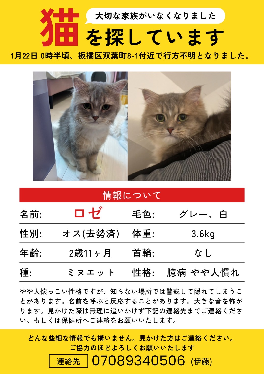 2023.03.192025.04.27 共有: ツイート 通知 すべてクリア 2026年1月22日 東京都板橋区で「ミヌエット」の「ロゼ」が迷子になりました。#迷子 #猫 #迷い猫 #ネコ #東京都 #ミヌエット 猫の迷子 最新の投稿 : ロゼ 4時間前 1 投稿 1 ユーザー 0 Reactions 97 表示 投稿: 1 ロゼ トピックスターター 2026年1月22日 10:07 (@roze_0220) New Member 結合: 4時間前 毛色はグレー×白で性格は臆病です。声色は高め、白の靴下猫です。年齢は2歳11ヶ月、体重は3.6キロです。板橋区双葉町8-18付近を散歩中カートが倒れた際にハーネスを抜けて逃げてしまいました。 発生日付2026-01-22 都道府県東京都 市区町村板橋区双葉町 動物の種類ミヌエット 動物の名前ロゼ 動物の色ブルーシェーデッドゴールデン 動物の年齢2才 動物の性別男の子 電話番号070-8934-0506 画像-1 返信を追加 返信する 投稿者名投稿者メールアドレスタイトル * 添付ファイル: 許可された最大ファイルサイズ 1GB 返信をメールで受け取る プレビュー 0リビジョン 下書き保存 保存しました 投稿者名 * 投稿者メールアドレス * 添付ファイル: 許可された最大ファイルサイズ 1GB 返信をメールで受け取る 返信を追加 キャンセル プレビュー 0リビジョン 下書き保存 保存しました