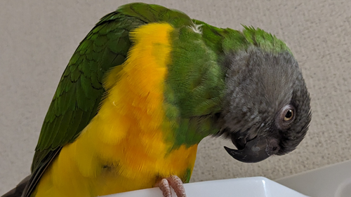 セネガルパロットという種類です。頭がグレー、お腹が黄色、背中と羽は緑です。セキセイインコよりは大きめで、全長20cm前後、130g程度です。