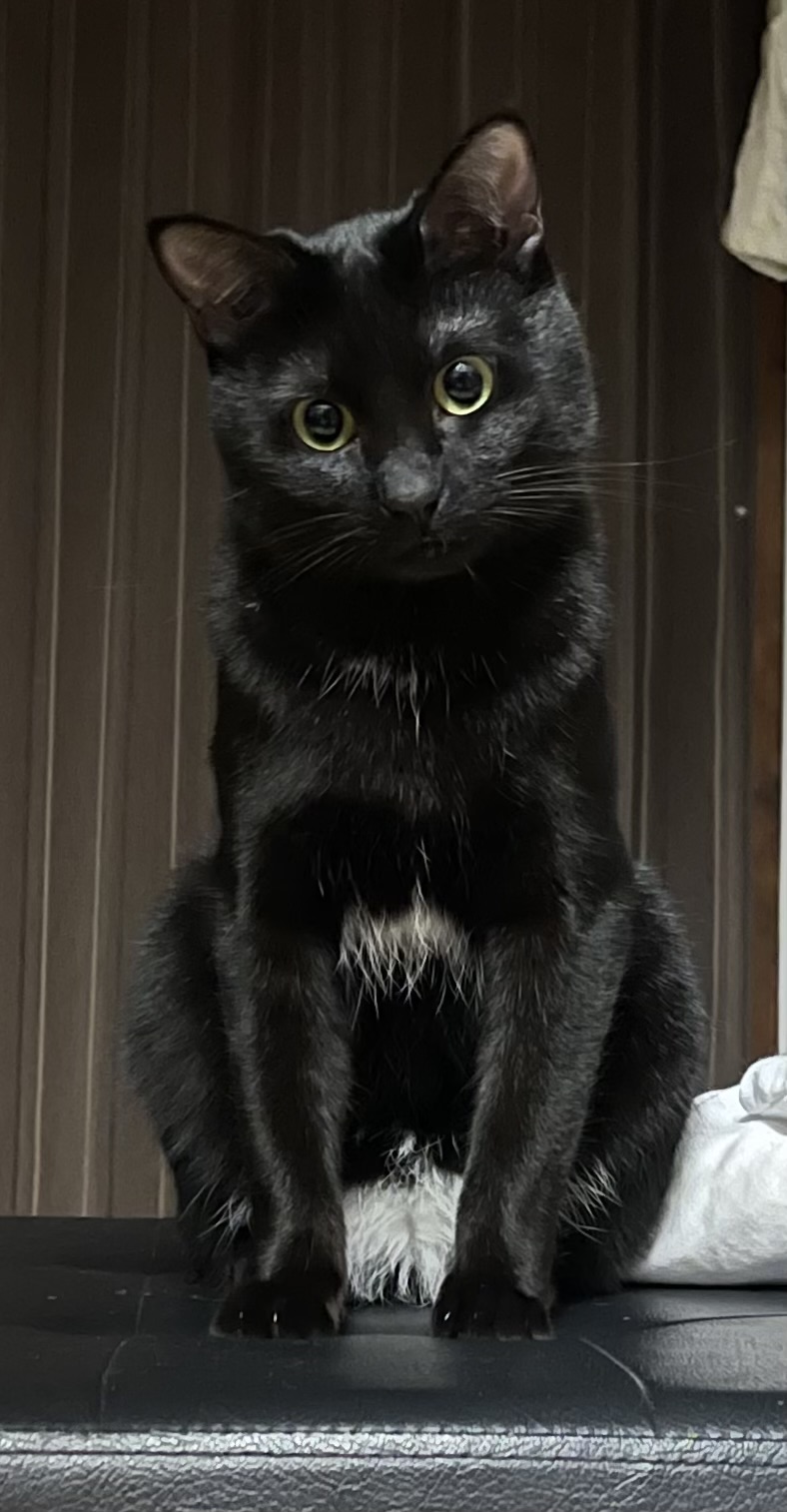 特徴:真っ黒、お腹周りが白、尻尾は短い(ボンボン)、細身、喧嘩はしないと思います。