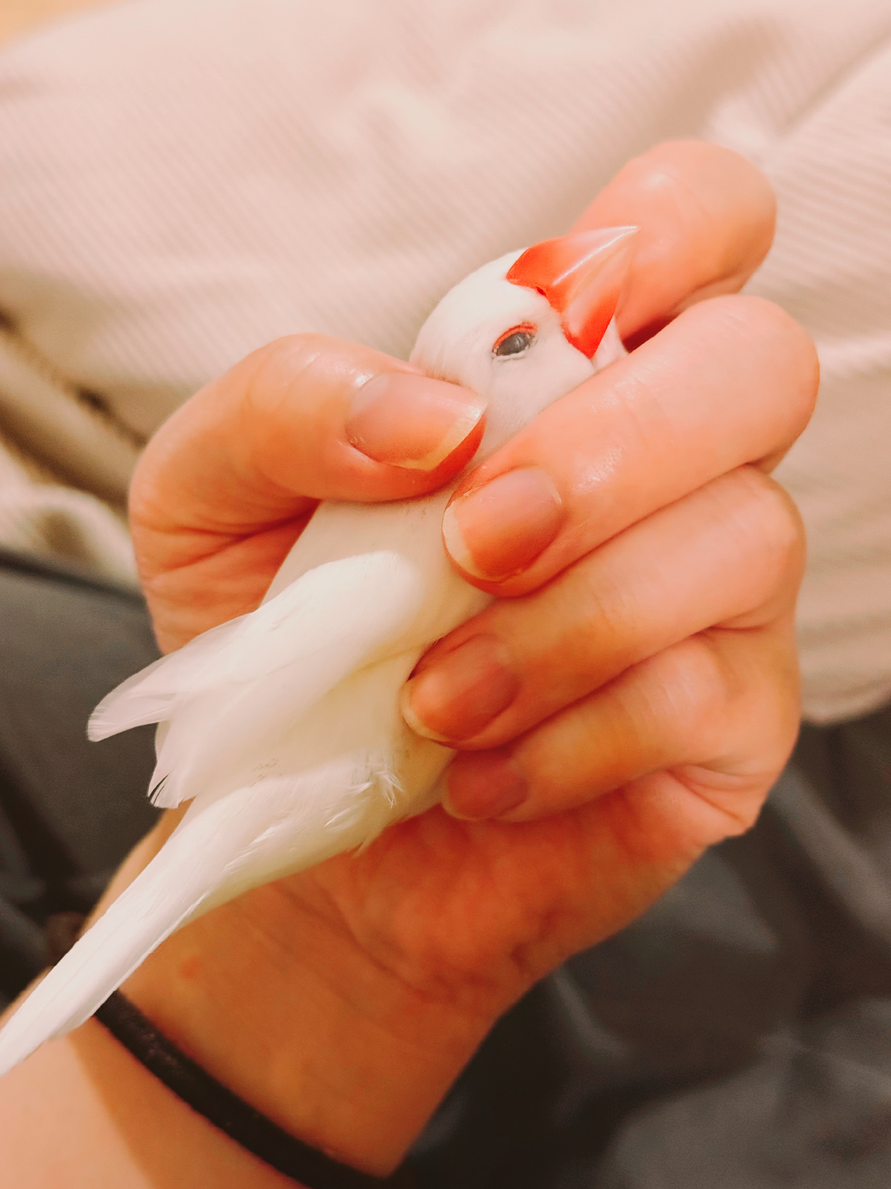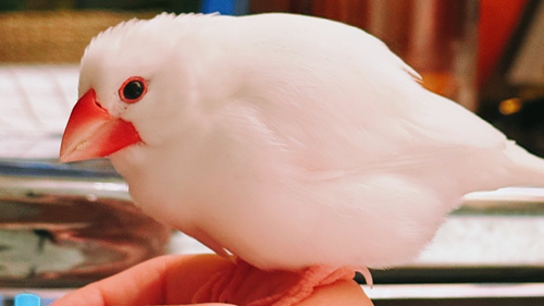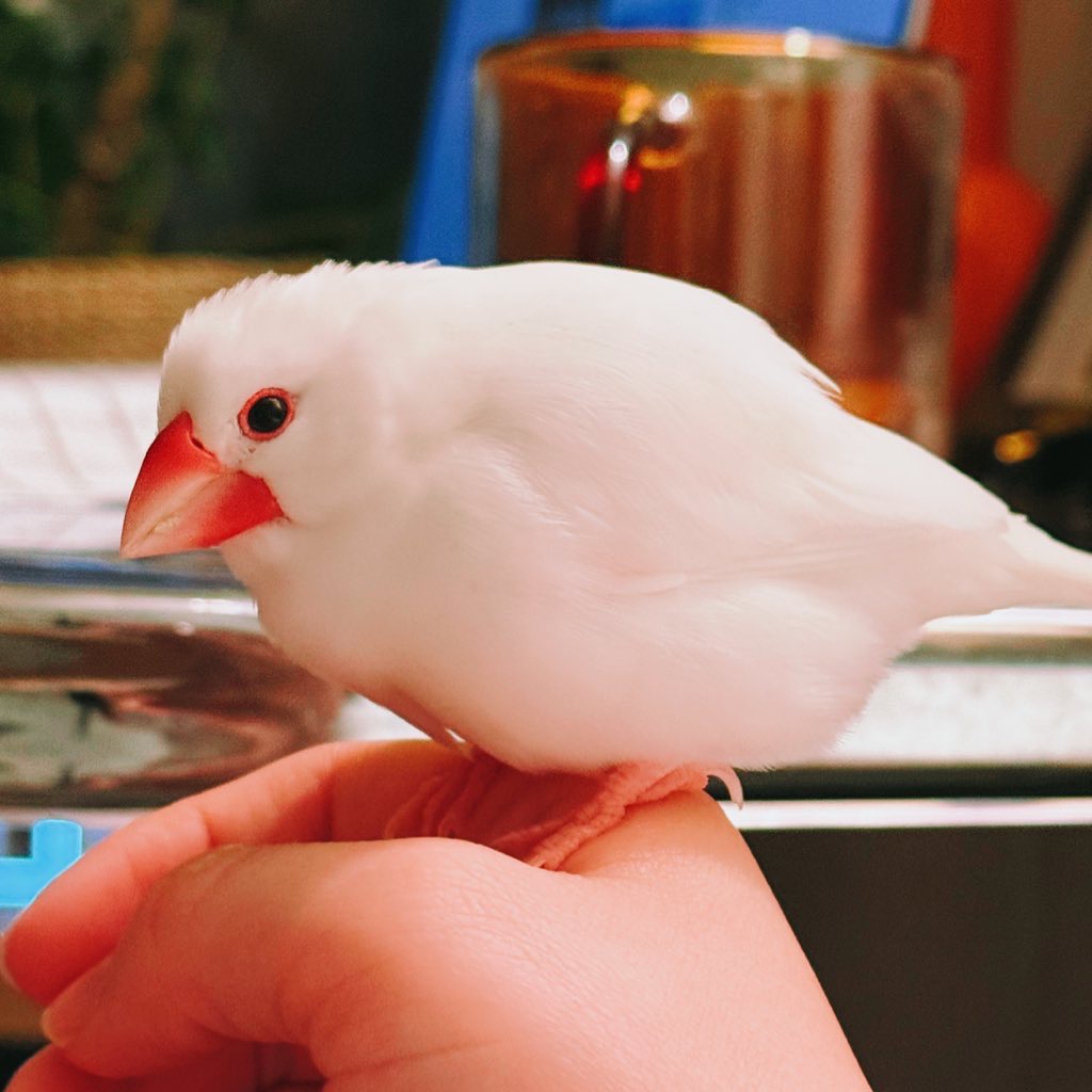 白い文鳥で、警戒心は強いですが人慣れしており「フィオ」と名前を呼べば人の肩や手に乗って来ます。