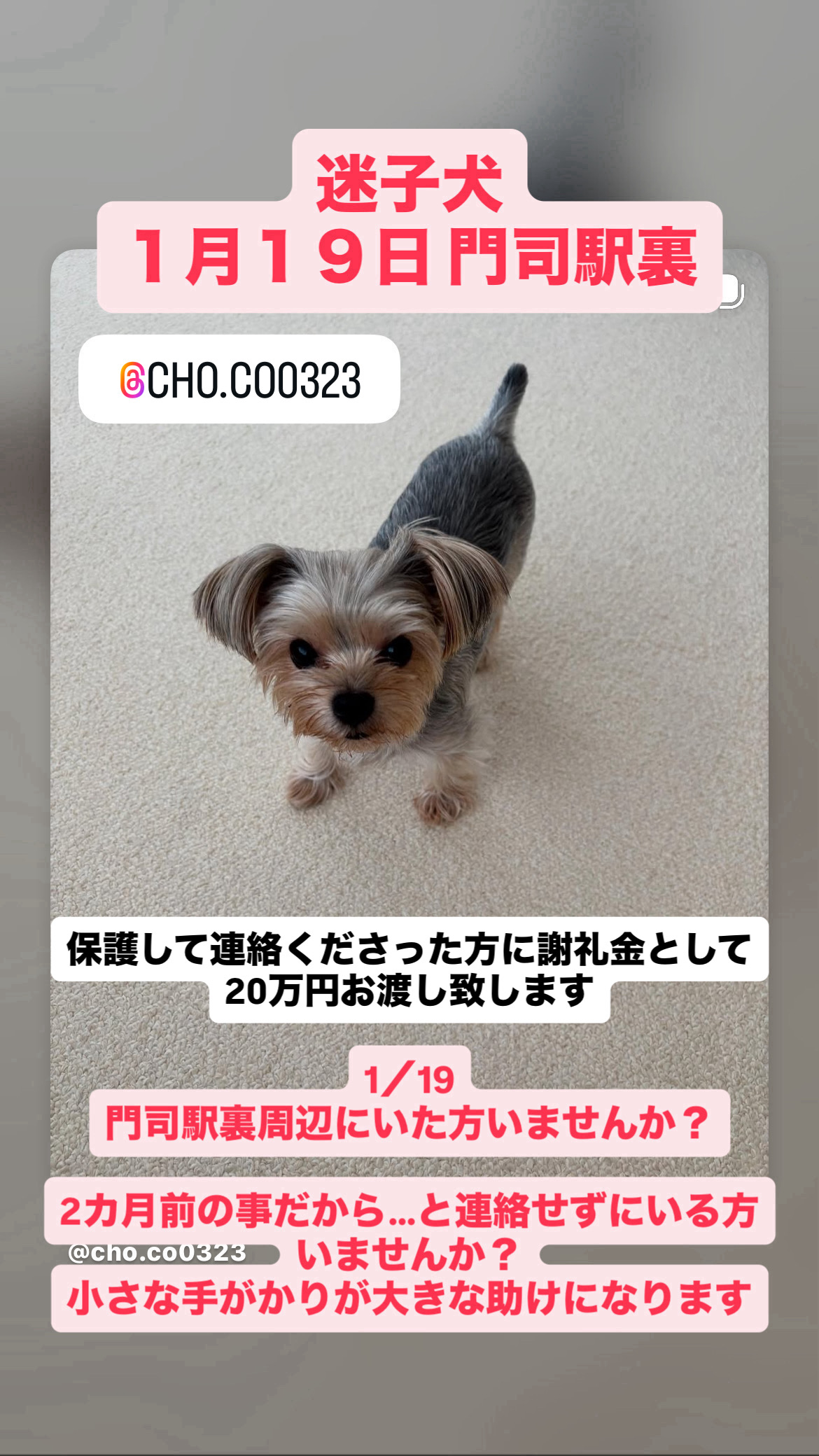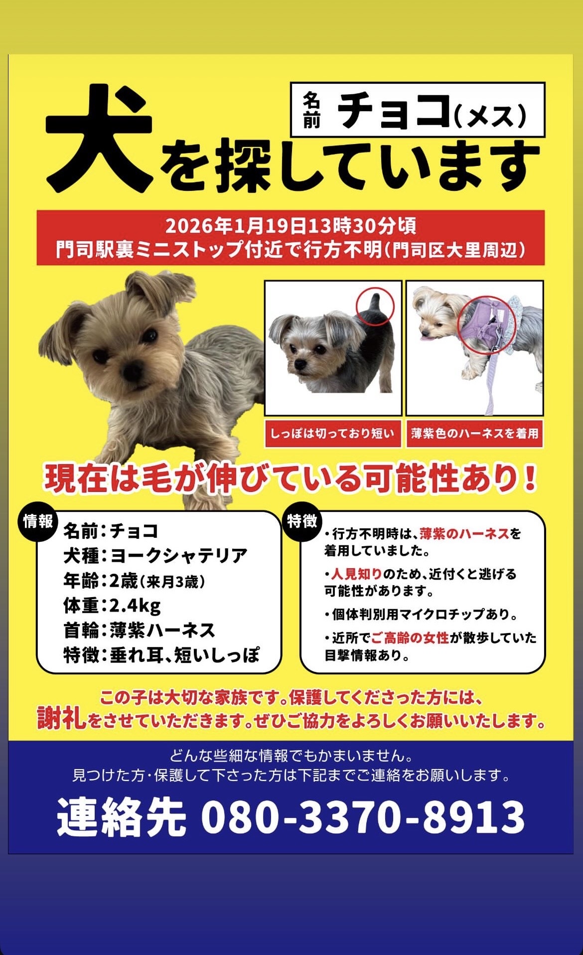 2023.03.192025.04.27 共有: ツイート 通知 すべてクリア 2026年1月19日 福岡県北九州市門司区で小型犬の「ヨークシャテリア」の「ちょこちゃん」が迷子になりました。#迷子 #犬 #迷い犬 #イヌ #福岡県 #ヨークシャテリア 犬の迷子 最新の投稿 : ちょこ 2時間前 1 投稿 1 ユーザー 0 Reactions 54 表示 投稿: 1 ちょこ トピックスターター 2026年3月30日 18:50 (@cho-co) New Member 結合: 2時間前 2.4キロ、小型犬ヨークシャテリア メス 毛の色は、グレー系 垂れ耳・尻尾短い 人見知り・怖がり 発生日付2026-01-19 都道府県福岡県 市区町村北九州市門司区 動物の種類ヨークシャテリア 動物の名前ちょこちゃん 動物の色グレー 動物の年齢3才 動物の性別女の子 電話番号080-3370-8913 画像-1 画像-2 画像-3 画像-4 返信を追加 返信する 投稿者名投稿者メールアドレスタイトル * 添付ファイル: 許可された最大ファイルサイズ 1GB 返信をメールで受け取る プレビュー 0リビジョン 下書き保存 保存しました 投稿者名 * 投稿者メールアドレス * 添付ファイル: 許可された最大ファイルサイズ 1GB 返信をメールで受け取る 返信を追加 キャンセル プレビュー 0リビジョン 下書き保存 保存しました