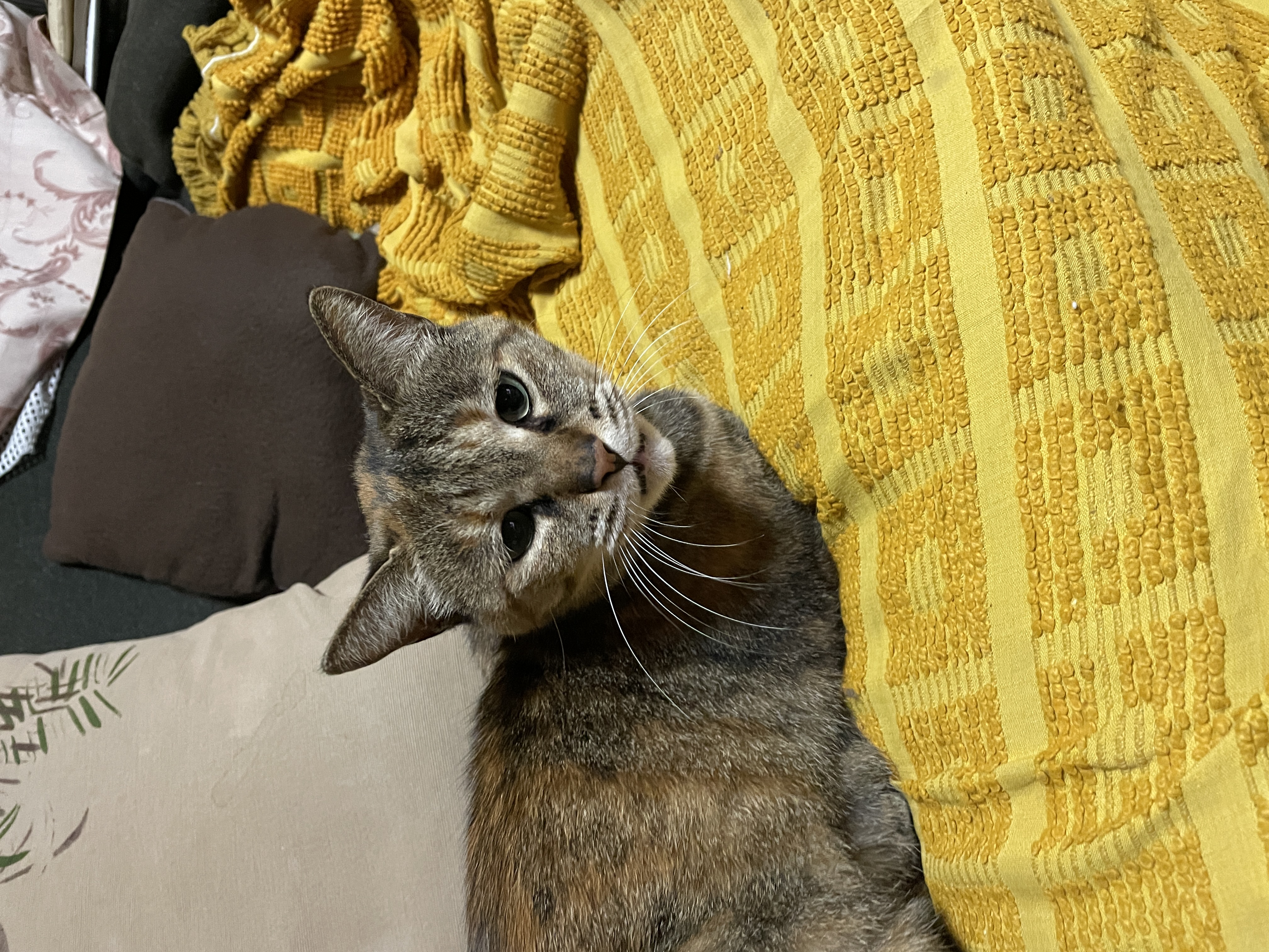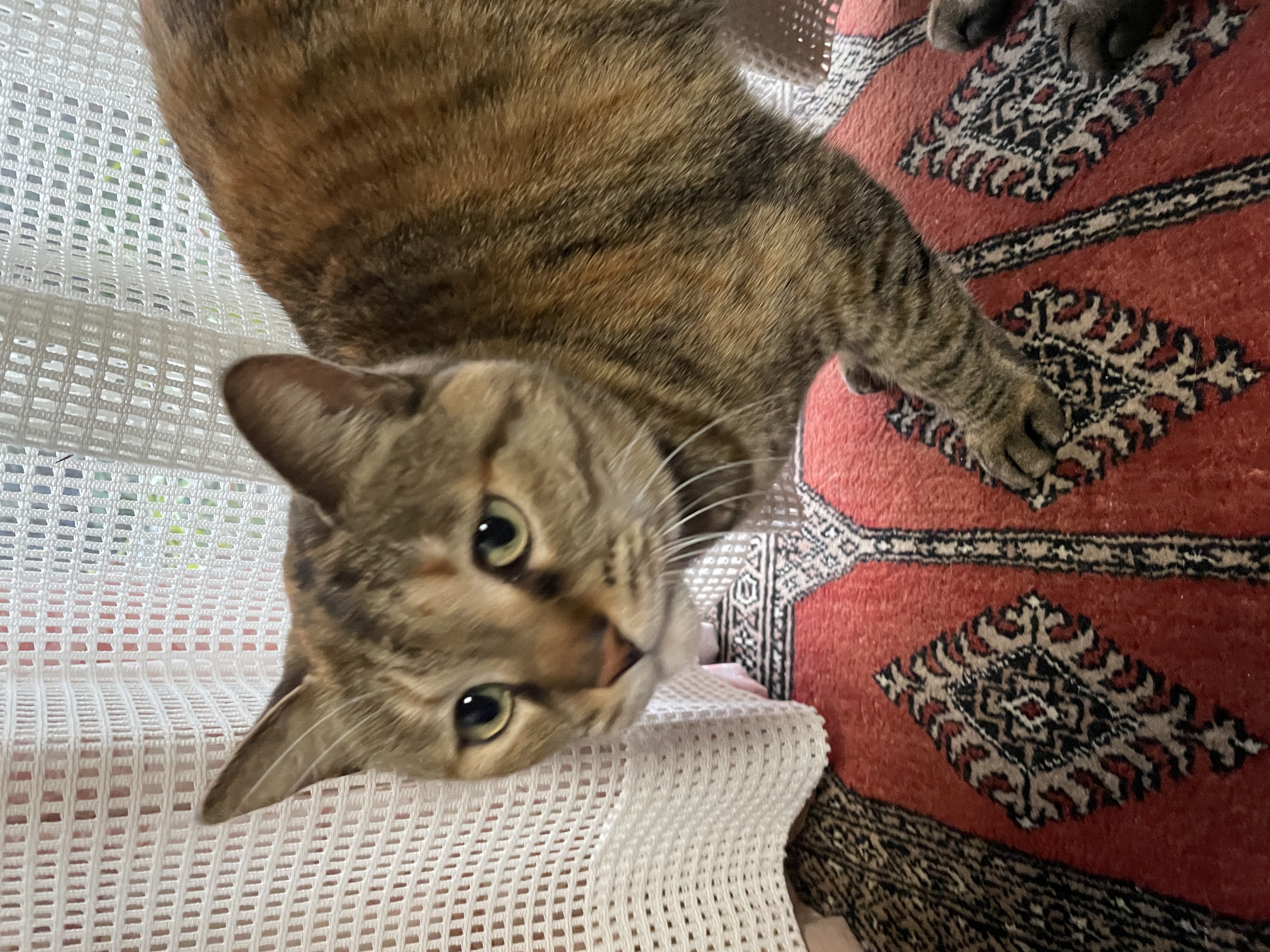 薄茶のトラネコ柄のメス。人懐こくおしゃべり。