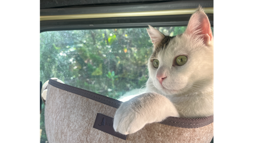 緑のハーネスを着けた白キジの猫を見かけたら、すぐに連絡ください。