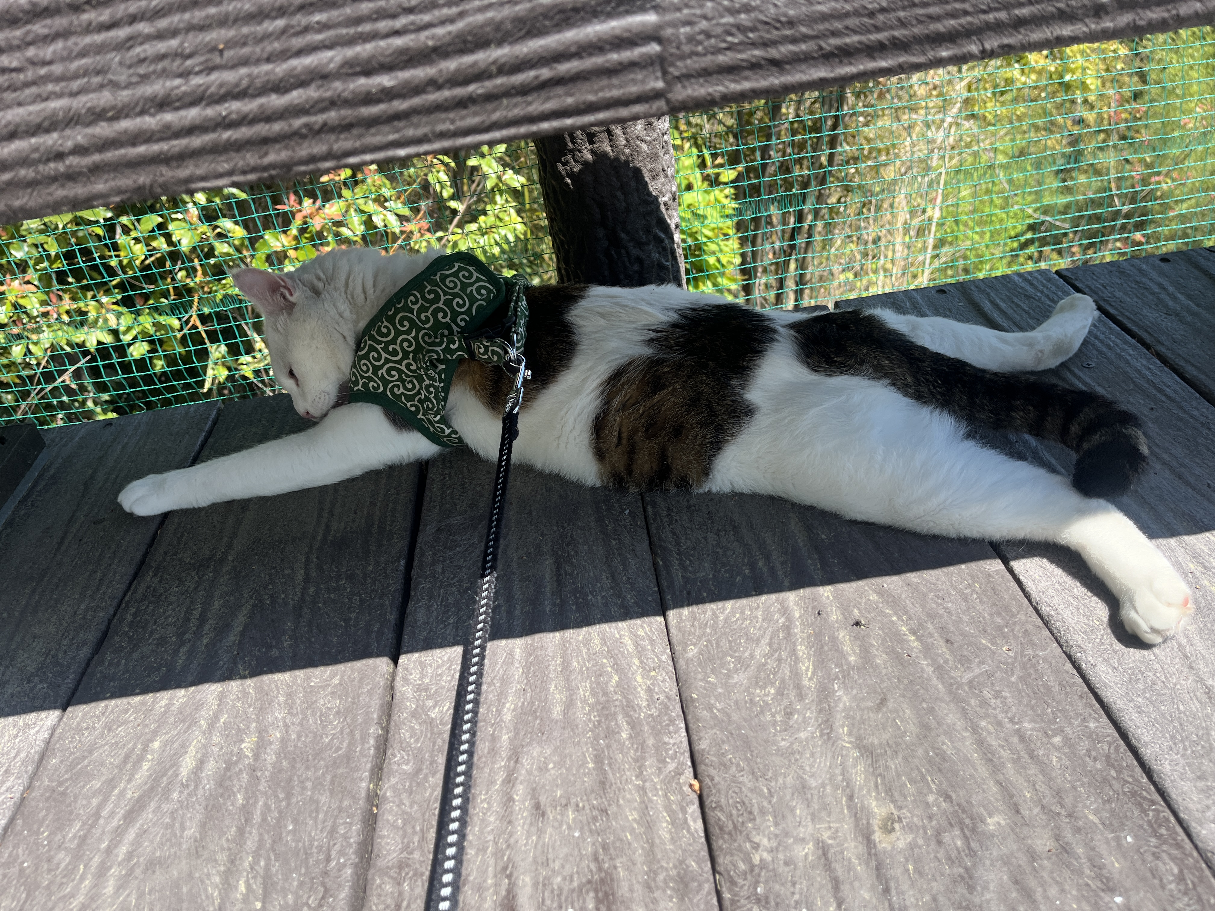 ・着用物:緑色のハーネスとピカピカ光る黄色の首輪(おそらく今は電池切れです)