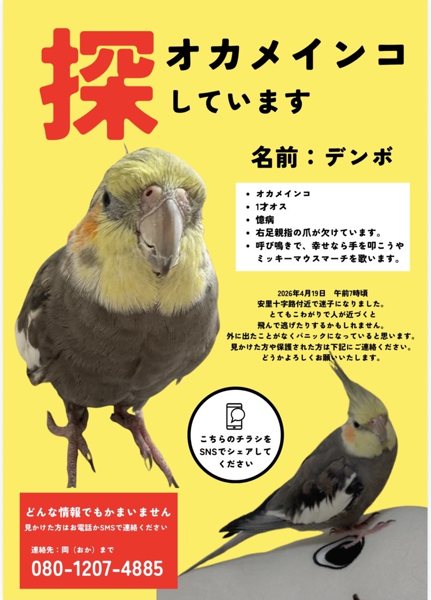 2026年4月19日 沖縄県那覇市で「オカメインコ」の「デンボ」が迷子になりました。#迷子 #鳥 #迷い鳥 #迷いインコ #沖縄県 #オカメインコ
