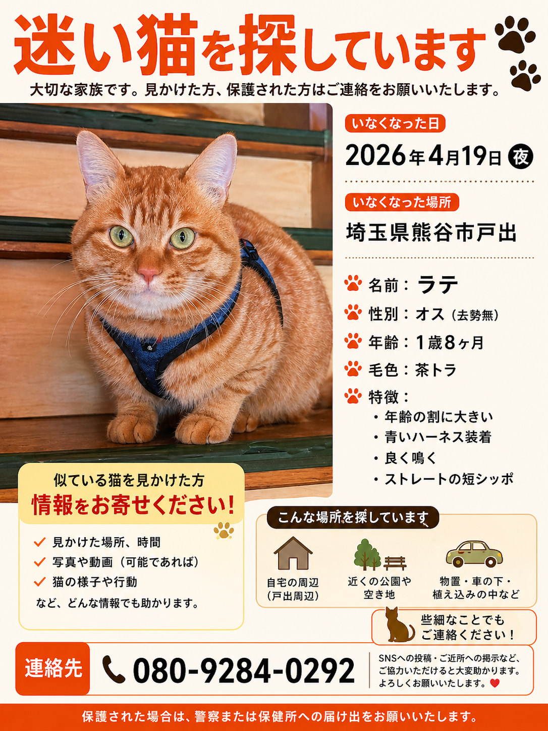 2026年4月19日 埼玉県熊谷市で「茶トラ猫」の「ラテ」が迷子になりました。#迷子 #猫 #迷い猫 #ネコ #埼玉県 #茶トラ猫