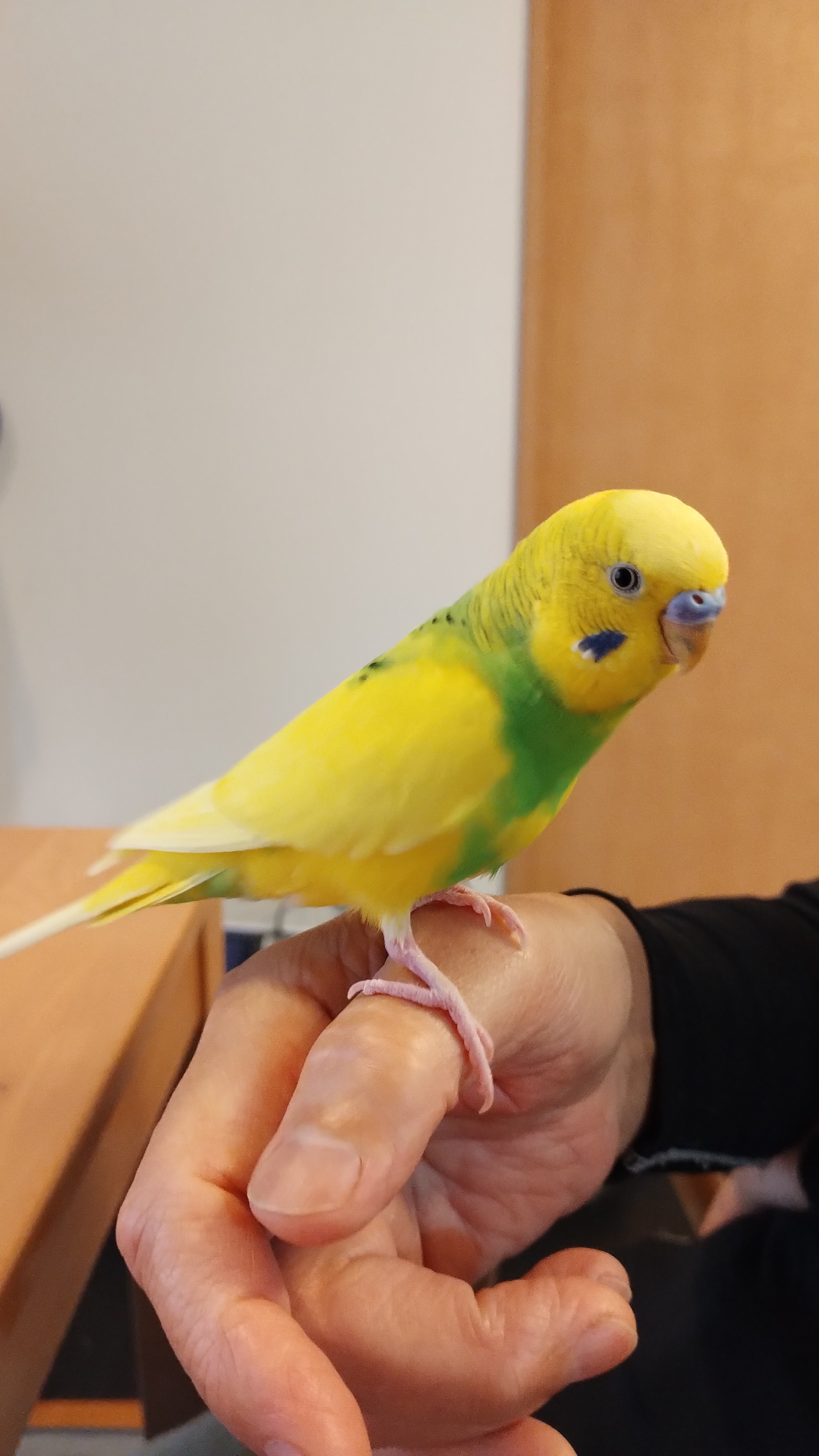 黄色、胸のあたりに緑色が入ったオスのセキセイインコです。