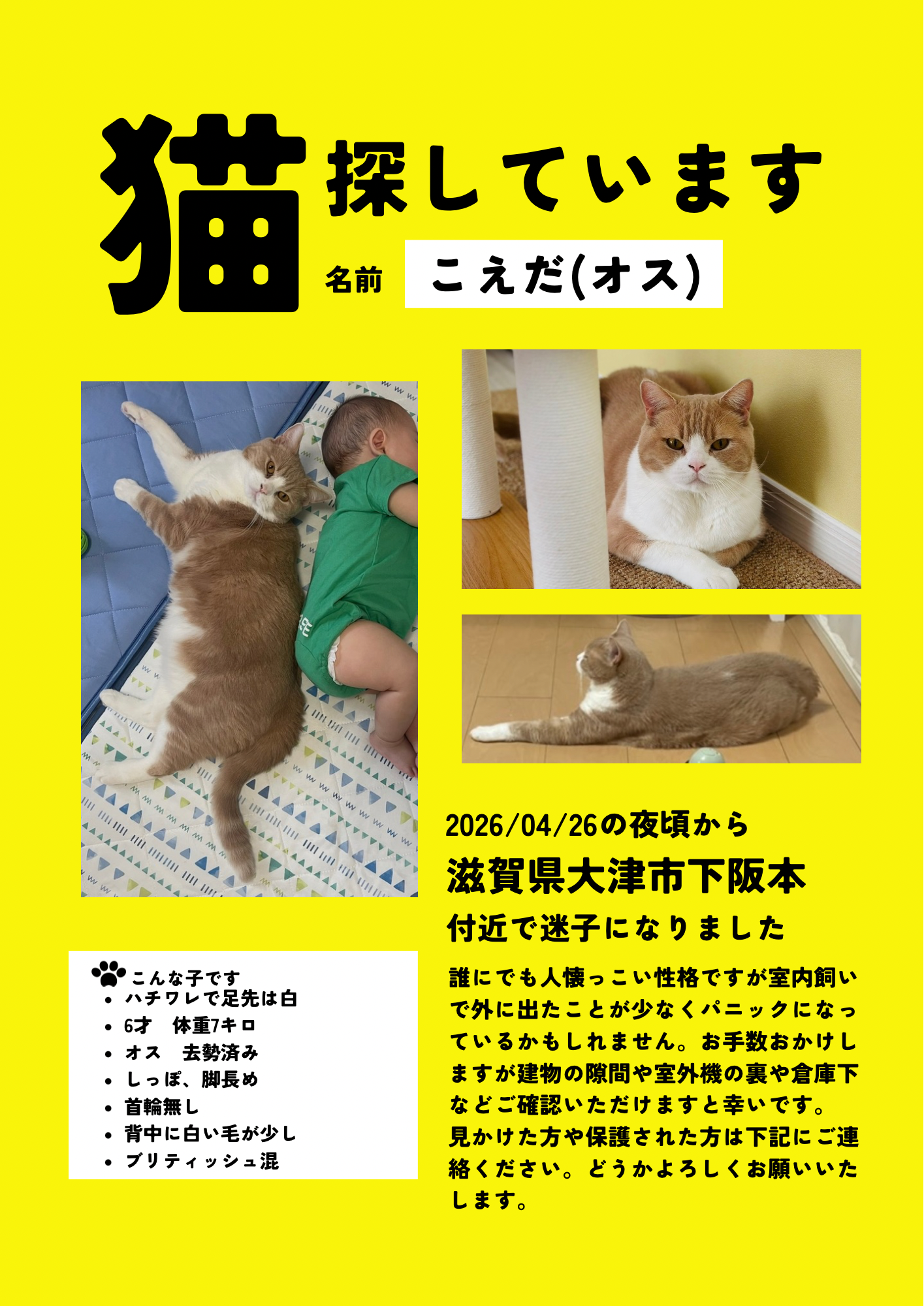 室内飼いでしたが初めて外に脱走してしまい戻って来れていません。