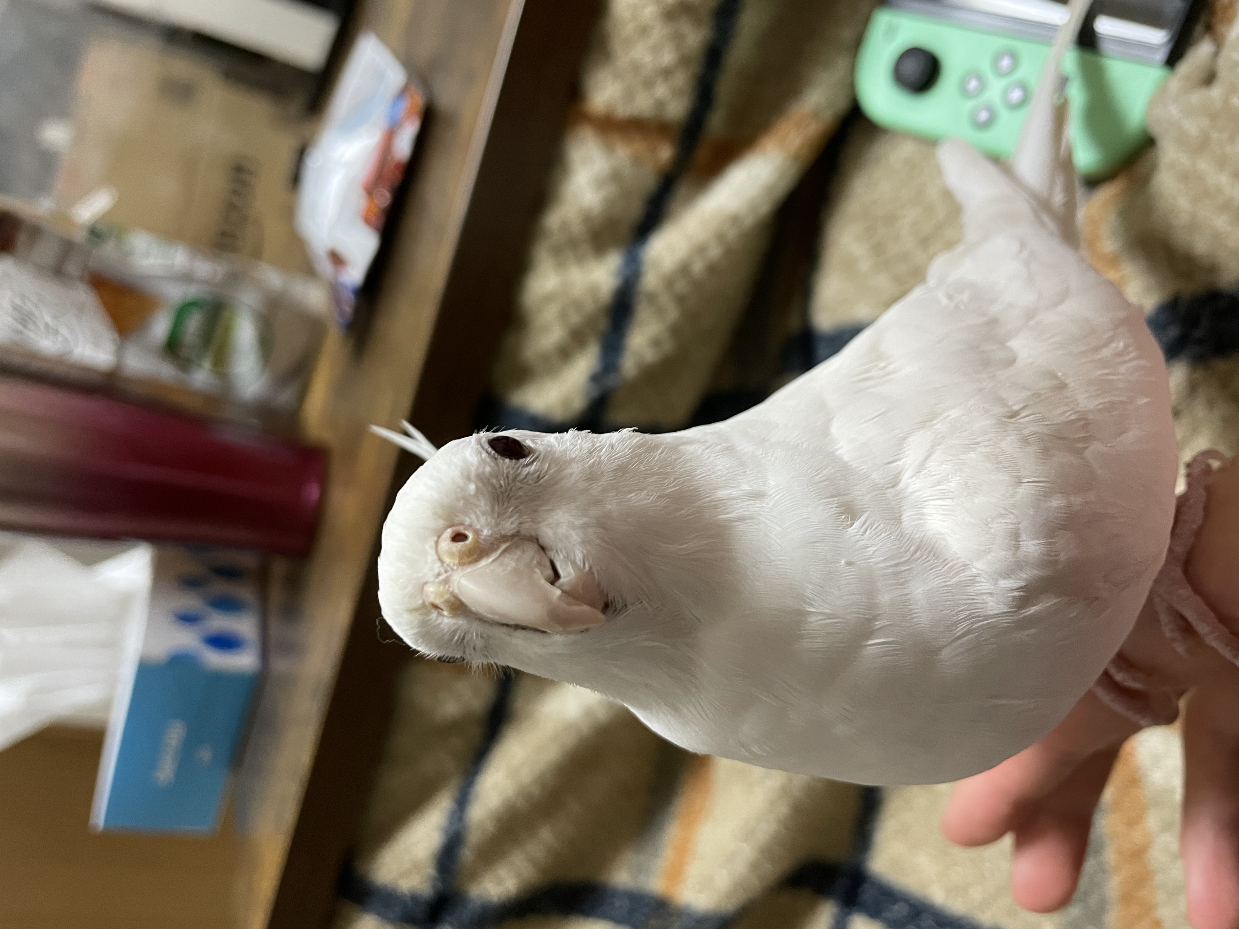 性別はオス、色はアルビノ(白)、年齢は5才です。特徴は「大きめで冠羽が生えています。真っ白でほっぺたも白です。不注意で玄関から出てしまいました。」です。