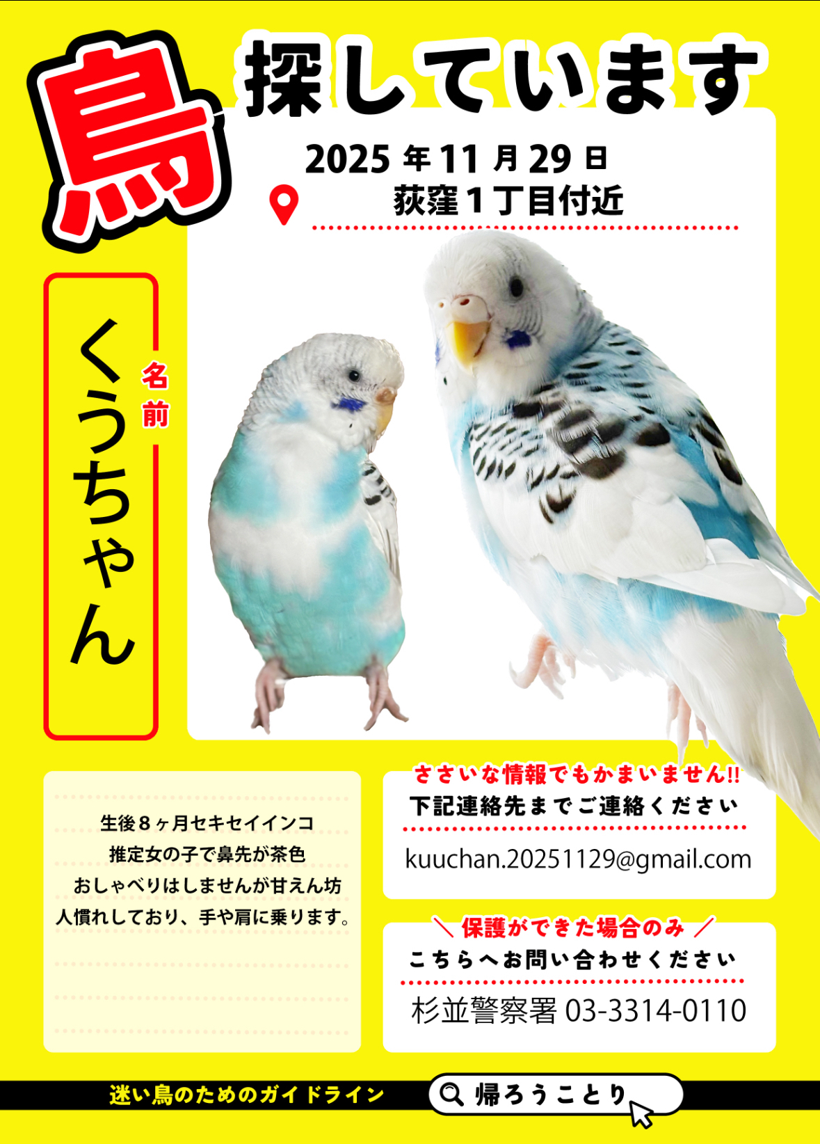 2025年11月29日(土)11時ごろに杉並区荻窪の自宅から青いセキセイインコが行方不明になってしまいました。見かけた方、保護していただいた方、ご連絡ください。